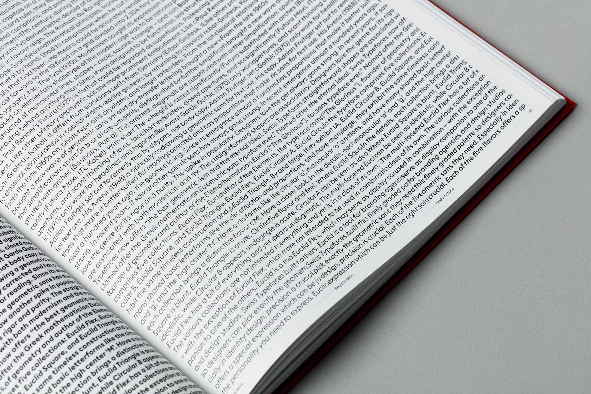More than three years after the release of their first typeface monograph, Swiss Typefaces is proud to announce the launch of a new book. “Euclid – Typeface Mystery No. 1” was conceived and designed by Hubertus Design. The typographic tome of 264 pages is a feast for the eyes, built around a story that will send a chill down your spine.
