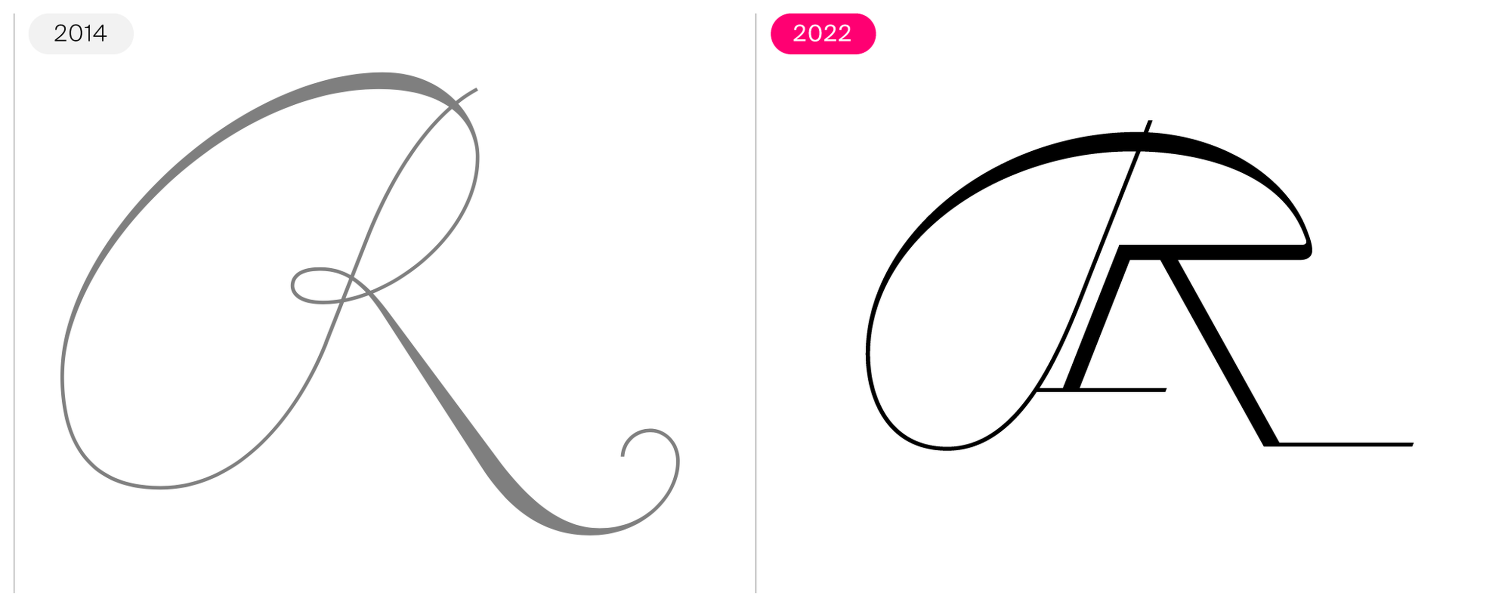 Classical early digital drawing of a calligraphed “R” and its final version in Raskal.
