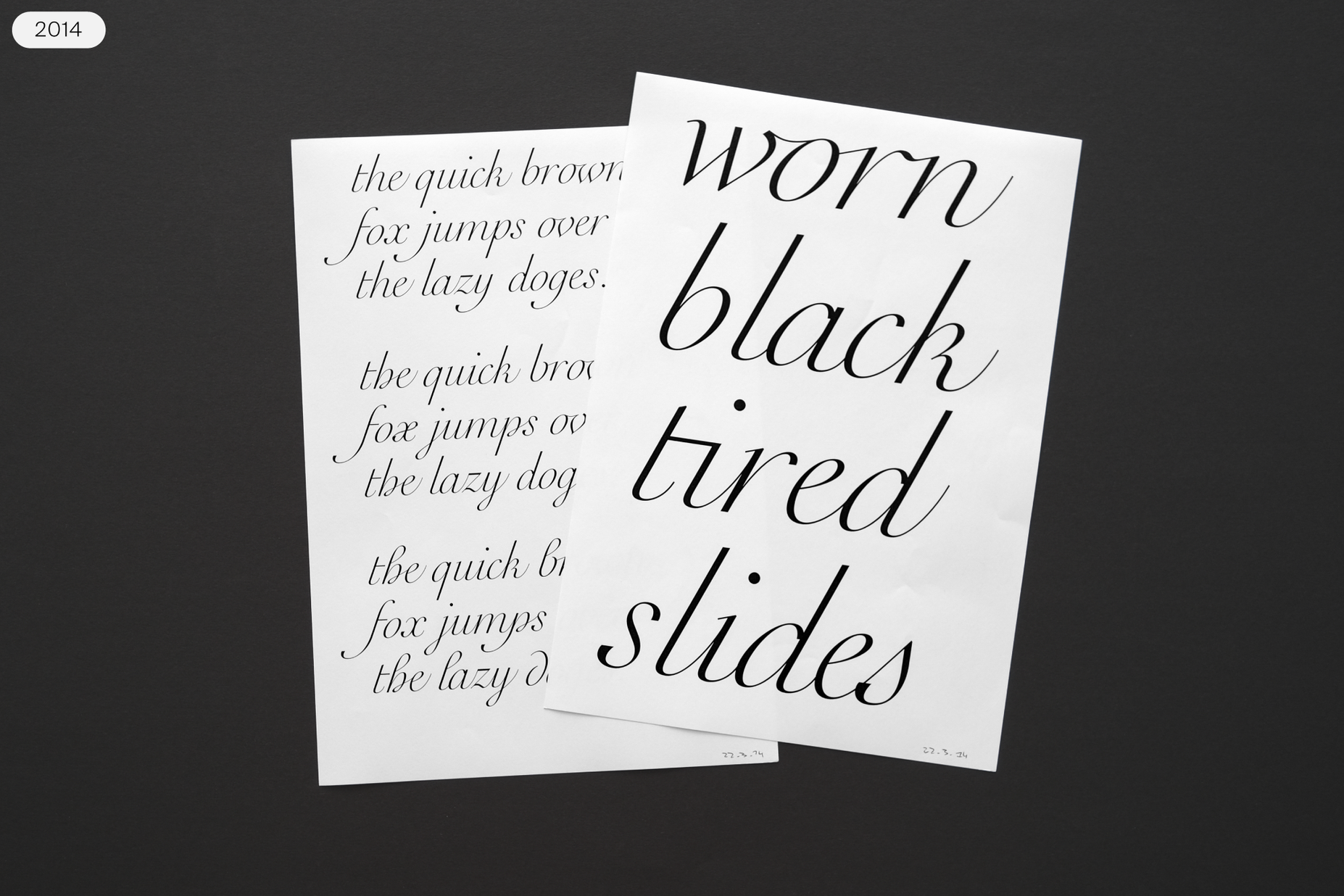 In 2015, Swiss Typefaces used an early version of Raskal, when it still looked more like a traditional script font, on the design of a skateboard from a series edited at the occasion of an event in Berlin. Each of that series’s four skateboards was named after a figure in type’s history. The Rudolf Koch design featured an early Raskal version (still labelled as a variant of SangBleu on the board). Koch was an influential calligrapher and type designer in early-20th-century Germany. While he never made a typeface based on 17th-century French script styles, designs made in the near-century since his death sometimes rhyme with elements from his work.