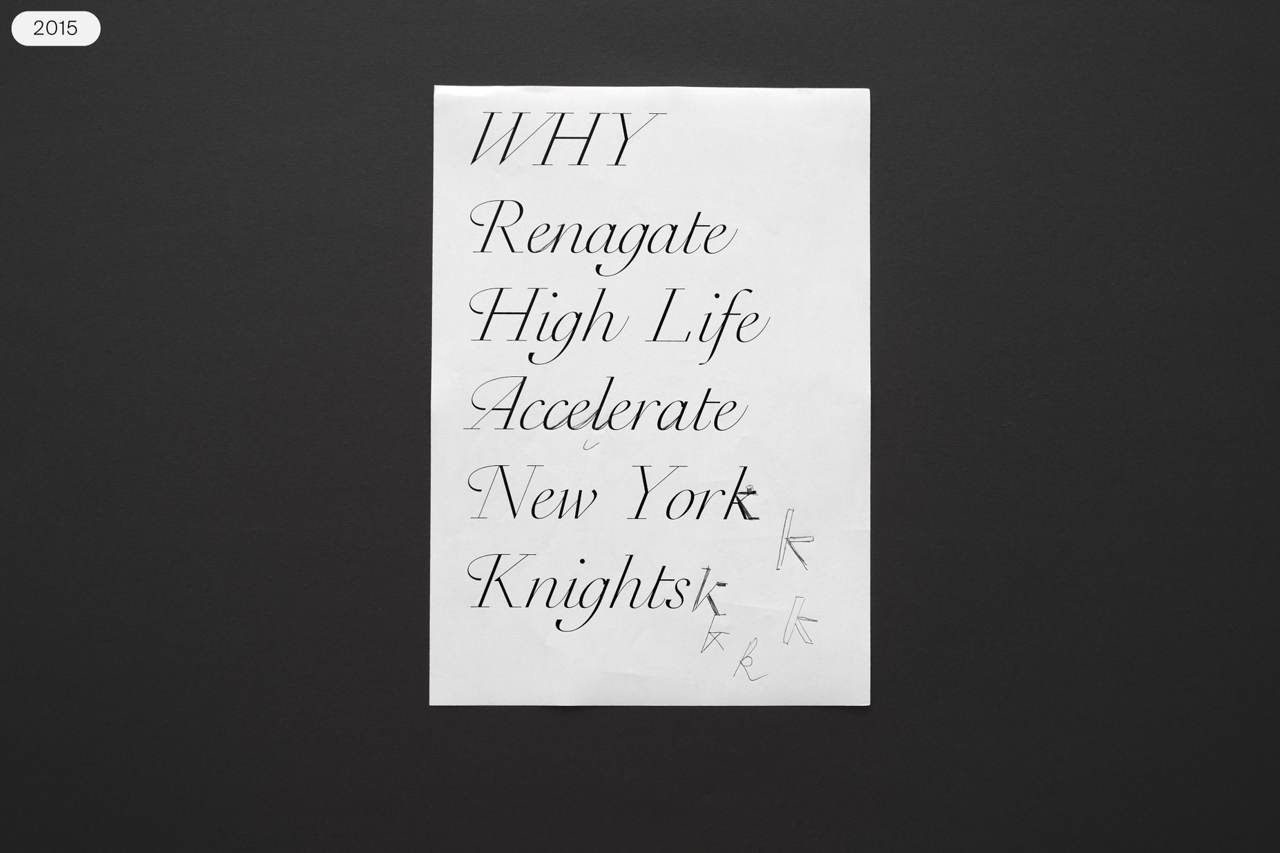 Raskal is a digital typeface. By saying this, I don’t mean to state the obvious. Of course, the font is a digital file for use with digital applications. Instead, what I mean is that the font’s design process was primarily a digital one. For many years, all its design and form-finding experiments were drawn digitally without resorting to sketches made by hand. Which might sound an aberration for a typeface inspired by calligraphy. However, very late in its development, Rey began making quick sketches on paper to help determine how some of its final glyphs might best look.